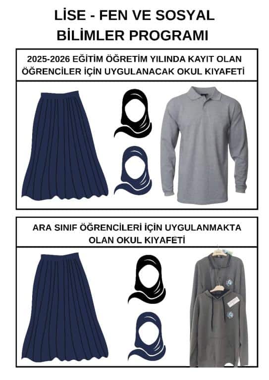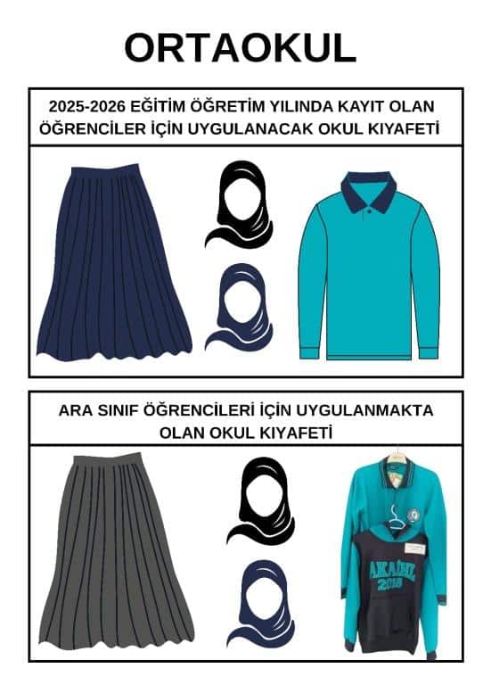 Millî Eğitim Bakanlığına Bağlı Okul Öğrencilerinin Kılık ve Kıyafetlerine Dair Yönetmelik ve Temel Eğitim Genel Müdürlüğünün 31/12/2024 tarihli yazısı ekinde bulunan “Okullarda Öğrencilerin Kıyafet / Formalarının Belirlenmesine Dair Usul ve Esaslar” da belirtilen 2025-2026 Eğitim-Öğretim yılından itibaren okul kıyafet/formalarının standartları yaş/sınıf seviyesine, okul türüne ve öğrencilerin fiziksel gelişimine uygun olacak şekilde özel işaret, baskı ve desen gibi kısıtlayıcı ayrıntılara yer verilmeden belirlenecektir hükmü uyarınca, okul öğrenci kıyafet / formaları aşağıdaki şekilde belirlenmiştir. Ara sınıflarda öğrenim gören öğrencilerimiz için önceki mevcut okul kıyafetleri kullanılmaya devam edilecek olup, yeni okul kıyafeti isteğe bağlıdır.